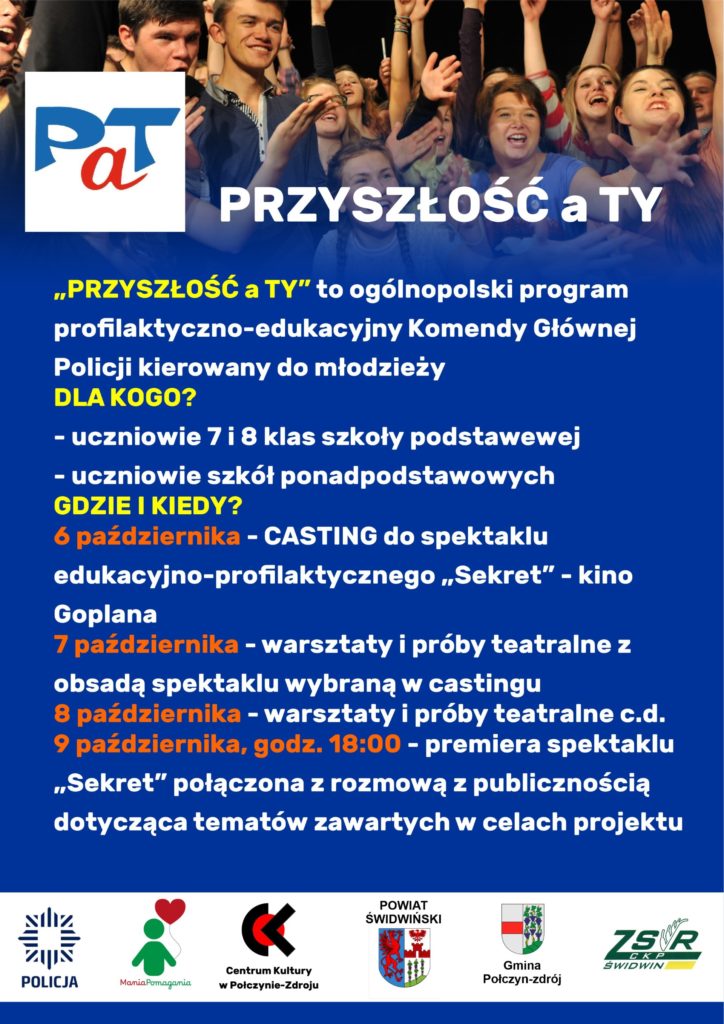 Zapraszamy na casting młodzież z Zespołu Szkół w Połczynie-Zdroju oraz młodzież klas siódmych i ósmych ze szkół podstawowych z miasta i gminy Połczyn-Zdrój w ramach projektu edukacyjno-profilaktycznego, prowadzonego metodą twórczej profilaktyki rówieśniczej.