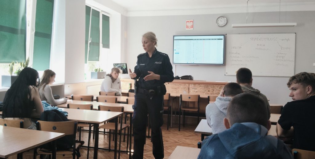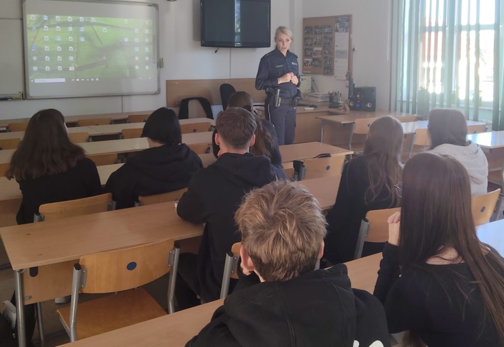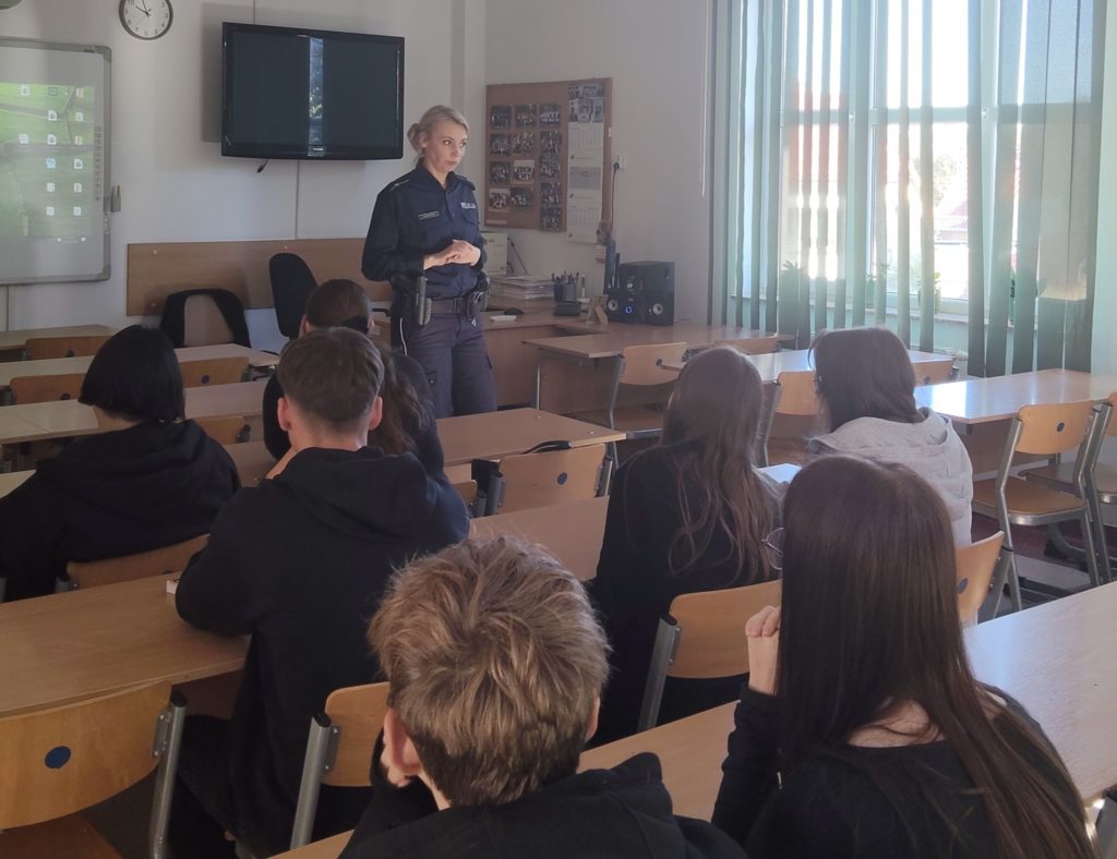 W ramach działań wychowawczo-profilaktycznych w naszej szkole odbyły się zajęcia profilaktyczne prowadzone przez policjantkę z Wydziału ds. Nieletnich mł.asp. Annę Kurażyńską. Tematyka spotkania obejmowała zagadnienia związane z demoralizacją, odpowiedzialnością prawną nieletnich, przemocą rówieśniczą oraz cyberprzemocą.
