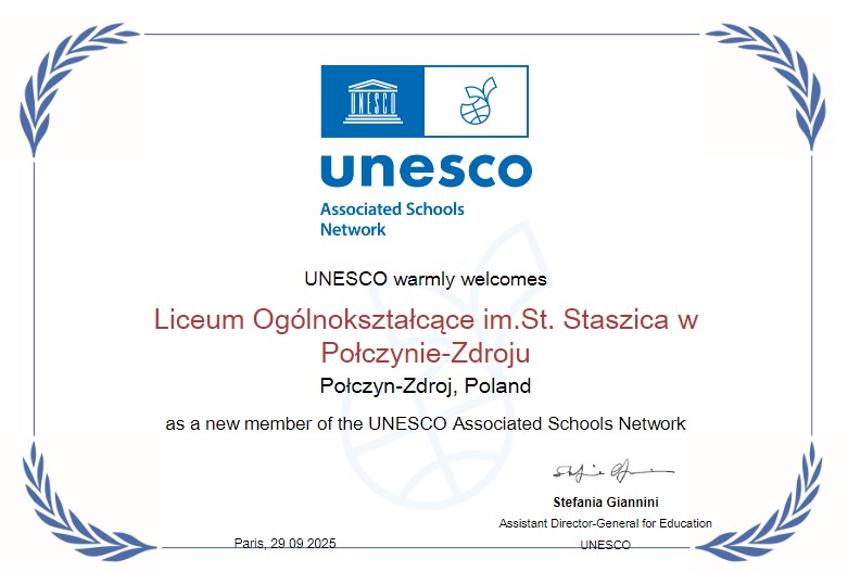 Z wielkim wzruszeniem i dumą informujemy, że Liceum Ogólnokształcące im. Stanisława Staszica w Połczynie-Zdroju po ponad 40 latach ponownie dołączyło do Sieci Szkół Stowarzyszonych UNESCO!